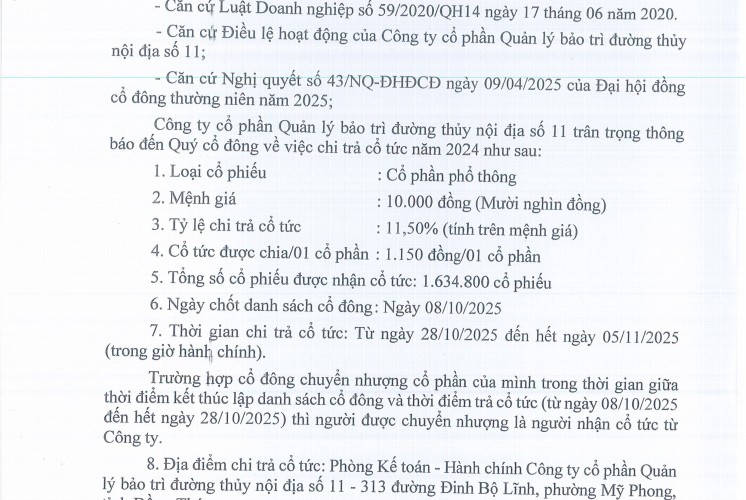Đại hội Đồng cổ đông thường niên năm 2020, Nhiệm kỳ 2020-2024; ngày 18 tháng 6 năm 2020 Đại hội Đồng cổ đông thường niên năm 2020, Nhiệm kỳ 2020-2024 của Công ty cổ phần Quản lý bảo trì ĐTNĐ số 11; diễn ra ngày 18 tháng 6 năm 2020 đã bầu ra Thành viên Hội đồng quản trị nhiệm kỳ 2020-2024. 1. Ông Nguyễn Thành Đồng 2. Ông Lê Thanh Phong 3. Ông Nguyễn Thanh Sơn 4. Ông Trần Văn Cường 5. Ông Bùi Tấn Phươ |